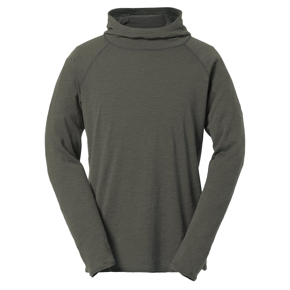 春夏向けベースレイヤー素材と同等、またはそれよりも軽いにもかかわらず、はるかにふくらみのある革新的なウール素材NUYARNを採用したロングスリーブフーディーです。素材の良さを引き出すために敢えてシンプルなデザインを採用し、レイヤードの際の肩まわりのごろつきをなくすためにラグランスリーブで仕上げています。コンパクトなフードは視界を妨げず、寒さや冷たい風から頭部を保護します。長い髪を束ねているとフードのおさまりが悪くなりますが、フード裏のスリットから束ねた髪を出せるので便利です。運動量の多いハイキングや雪山のラッセルにもオーバーヒートしないちょうどいい保温性と通気性、そして吸汗調湿性があります。