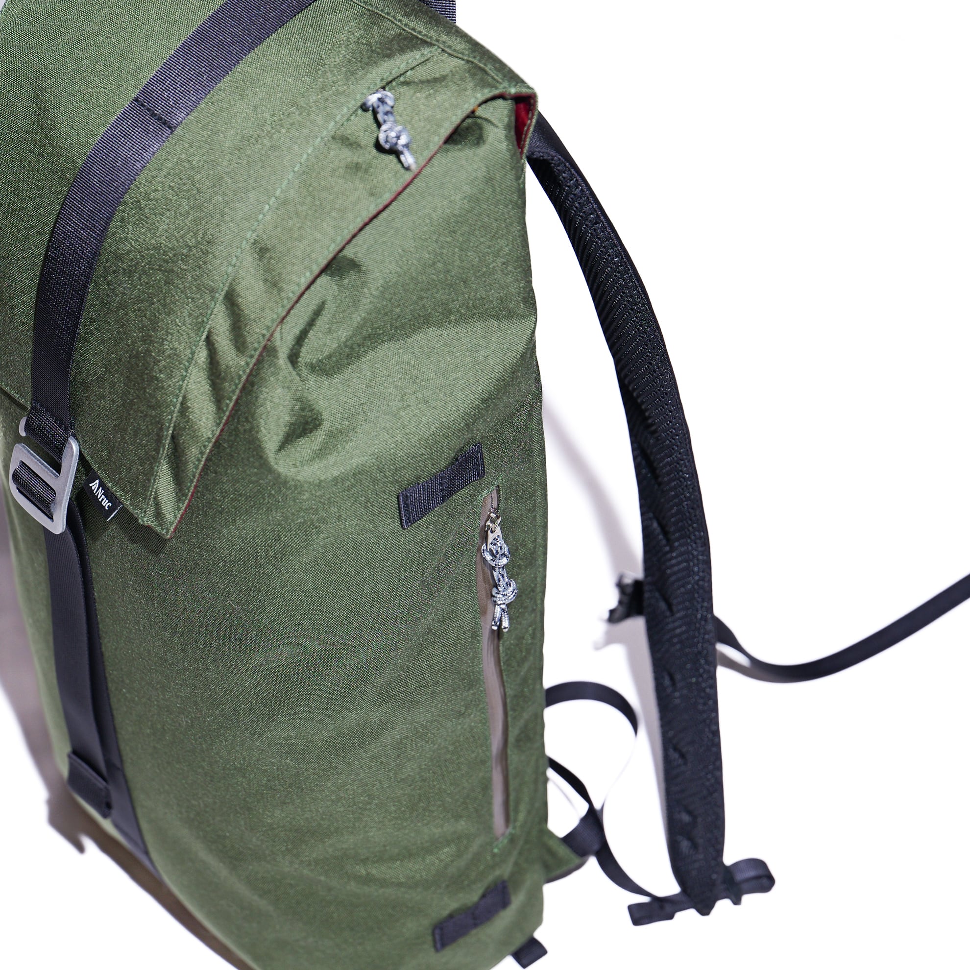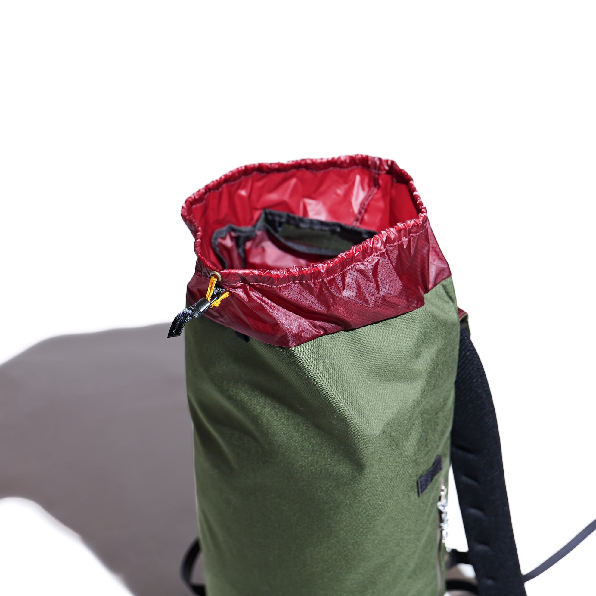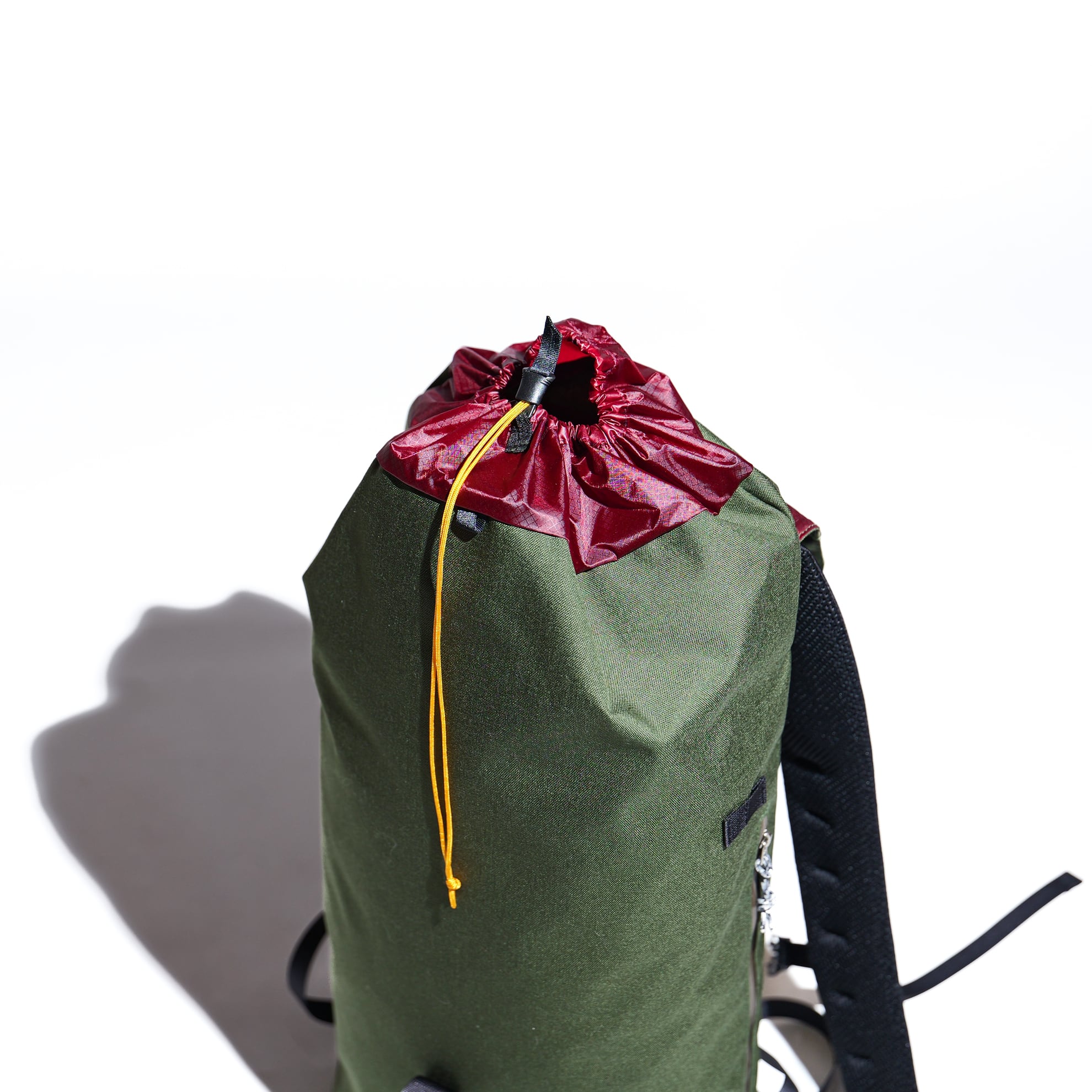 両サイドやボトムトップの巾着部には、機能性を拡張できる余白を残しており、ハイク優先で使用する場合はショックコードや細引きをプラスすればトレッキングポールやトレットチェアを保持できる仕組みになっています。