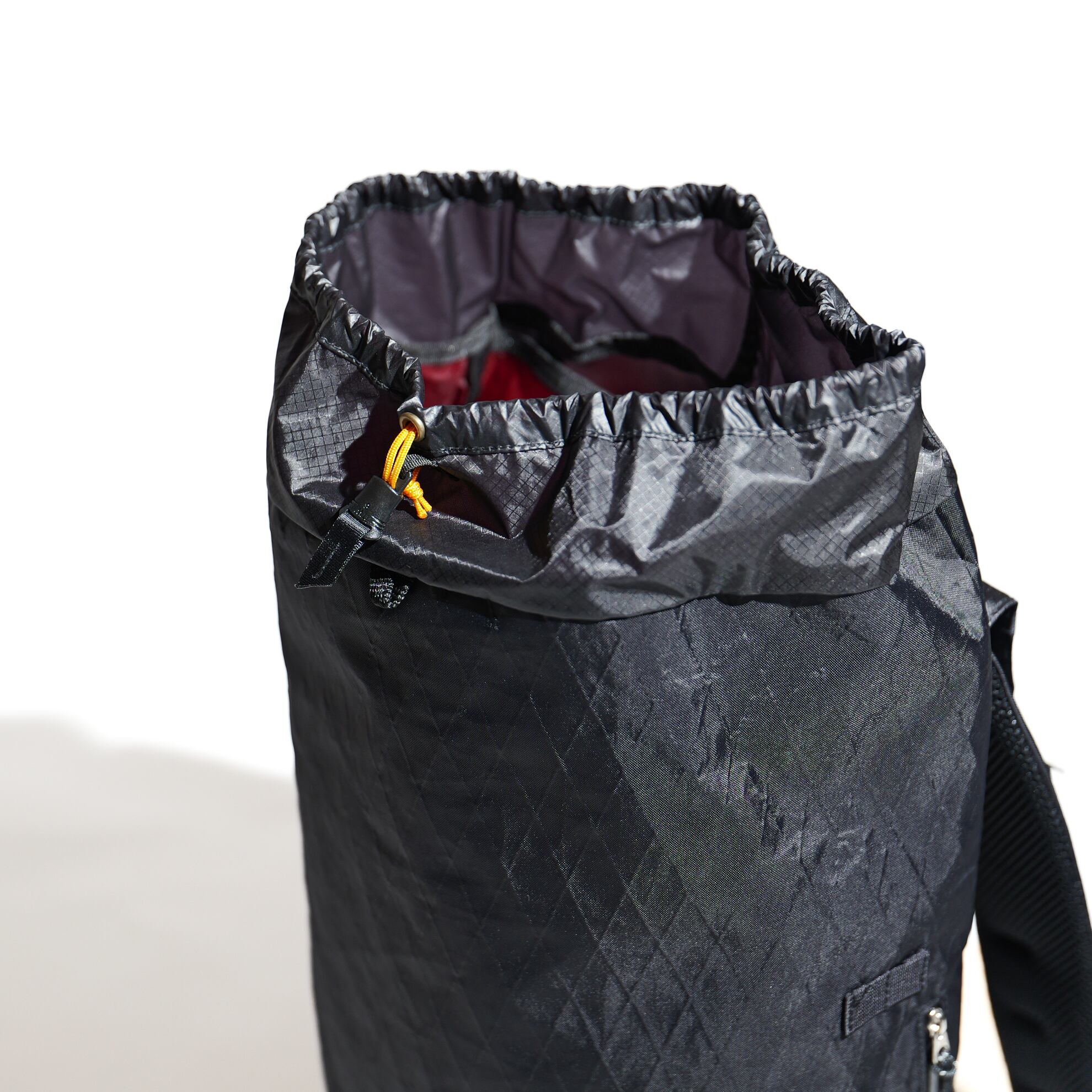 両サイドやボトムトップの巾着部には、機能性を拡張できる余白を残しており、ハイク優先で使用する場合はショックコードや細引きをプラスすればトレッキングポールやトレットチェアを保持できる仕組みになっています。
