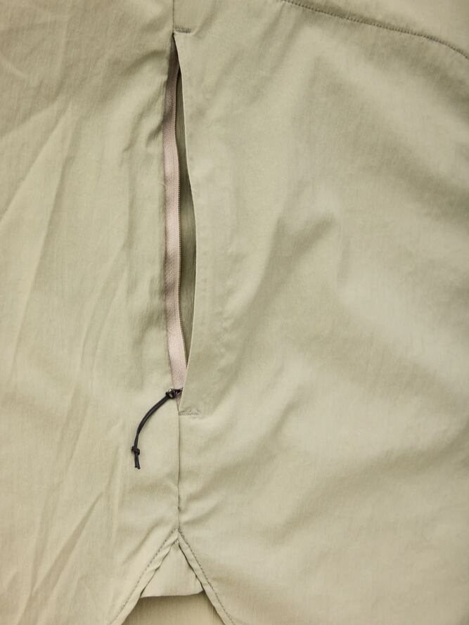 身幅をワンサイズ大きめにしてあるため締め付け感がなくて動きやすく、脇の下にはガセットを設けて腕上げもしやすいデザイン。ジェンダーレスで両腰にポケットを備え、左腰のポケットに本体を収納できるパッカブル仕様です。
