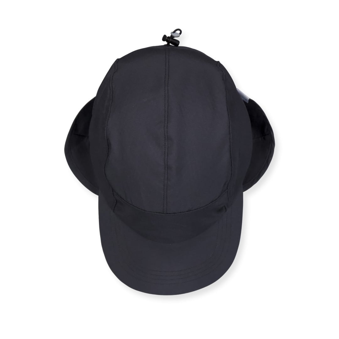 表面生地には防風性があり、PFASフリーの撥水加工が施されているため、小雪や急な雨から頭部を守ります。また、軽量なツバと組み合わせることで、キャップは小さく折りたたむことができ、荷物になりません。サイドのイヤーフラップは折り返しが可能な仕様で、伸縮性のある後頭部のドローコードでフィット感の調節が可能です。